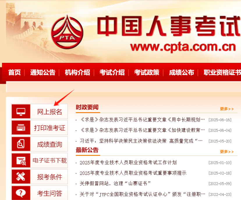 考生访问中国人事考试网http://www.cpta.com.cn/ ,点击【网上报名】进入考生登入页面。如图: