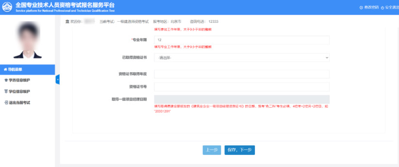 工作经历维护中的专业技术职务和专业职称是必填的,没有的选择“无”,其他信息根据考试实际要求填写。