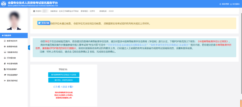 报考人员需按报名地考试机构要求上传相关证明材料备查,报名信息确认时会跳转到证明材料上传页面,根据页面提示,上传学历证书、学位证书等证明材料。