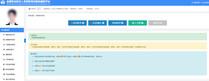 如果资格核查不通过,考生可以通过考试状态页面的状态信息栏查看到资格核查不通过的原因,如确实不符合报考条件,可以点击左侧【修改报考信息】修改报名条件重新进行报名信息确认,等待考试机构核查。