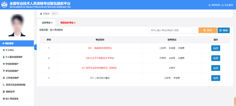 个人信息维护完成后,点击左侧的【进入网上报名】进入选择考试界面。选择要报考的考试及报名省份,点击【下一步】,显示【考试文件】,阅读完毕后,选中【已阅读并知晓】,可进入报考信息填写页面,按提示要求进行报名。