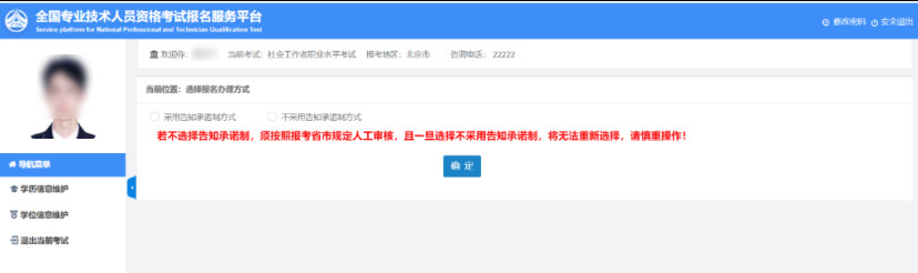 报名办理方式分为“采用告知承诺制方式”和“不采用告知承诺制方式”,考生需要选择报名办理方式。