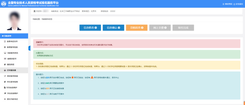 如果资格核查不通过,考生可以通过考试状态页面的状态信息栏查看到资格核查不通过的原因,如确实不符合报考条件,可以点击左侧【修改报考信息】修改报名条件重新进行报名信息确认,等待考试机构核查。
