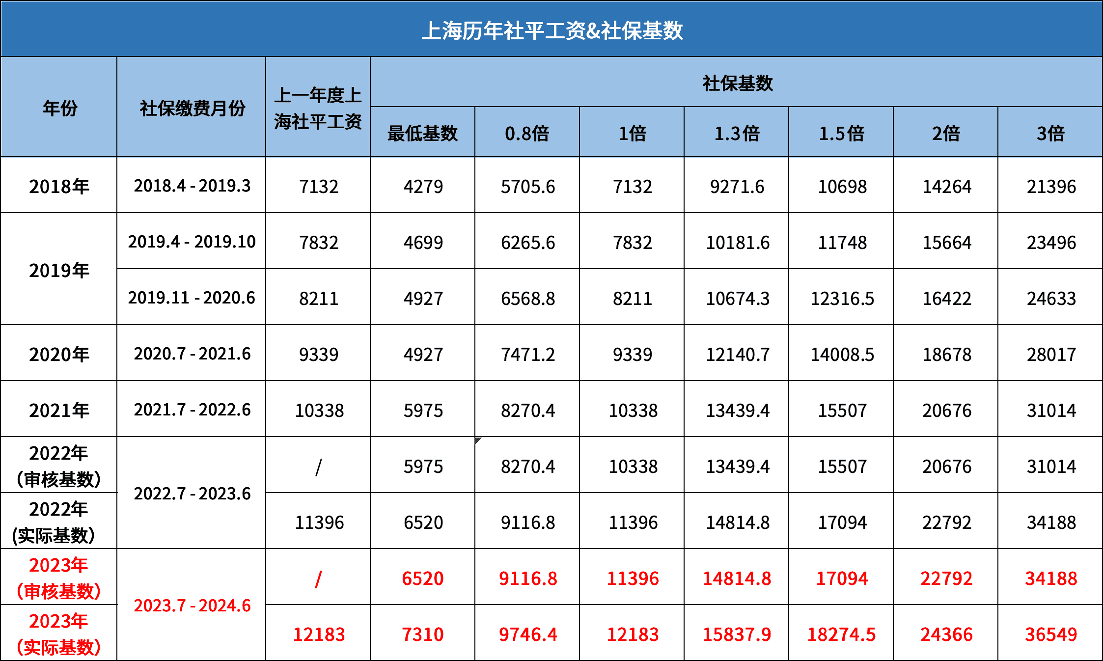 接下来看看上海历年的社平工资和社保基数